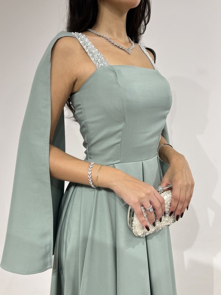 - فستان لون تيفاني, تتميز الأكتاف بتصميمها المزخرف بالترتر والخرز اللامع، مما يضيف لمسة من البريق والفخامة للفستان، ويجعل الأكتاف نقطة جذب مميزة.