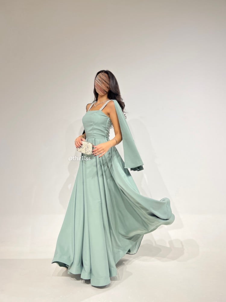 - يتسم فستان لون تيفاني, بقصّته الانسيابية التي تعانق الجسم برقة، مما يبرز قوام مرتديته بشكل جميل ومتناسق.