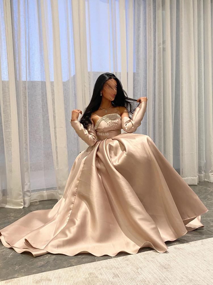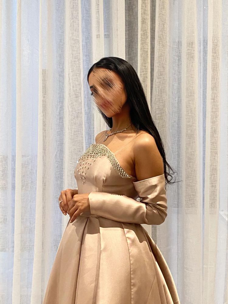 - فستان مطرز بالخرز, يتميز الفستان بتطريز يدوي كامل على منطقة الصدرية، حيث تم استخدام أفخم أنواع الخرز لتشكيل نقوش وزخارف دقيقة تعكس الضوء بشكل جميل وتلفت الأنظار, مما يجعله قطعة فنية فريدة تستحق الاقتناء.