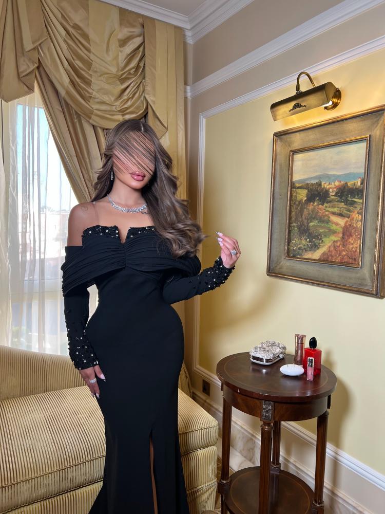 فستان أسود ملكي بتصميم سهرة فخم، يميزك بإطلالة ساحرة. يزدان الفستان بالشك اللامع عند الصدر مع أكمام منفصلة تضيف لمسة فخامة، وتصميم مكشوف أنثوي أنيق مع تفاصيل مقوّاة عند الأكتاف لإطلالة واثقة وجذّابة. مناسب للمناسبات الراقية والسهرات.